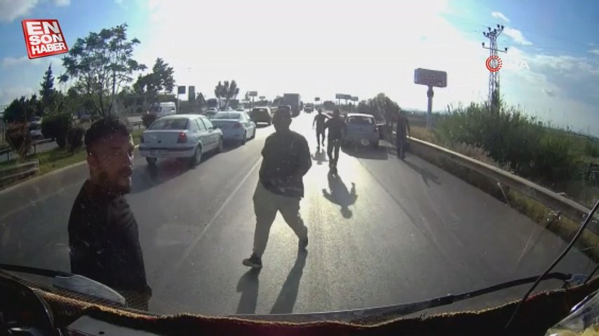 Antalya’da trafikte yol vermeme yüzünden çıktığı argüman edilen olayda bir araba şoförü, kamyonetin önünü kesti. Arabadakiler araçtan inip küfür ve tehditler savururken, olayın arbedeye dönüşeceğini düşünen kamyonet şoförü eşi ve çocuğunun da bulunduğu aracın camlarını kapatıp kilitledi.