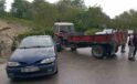 Islak yolda kayan traktör otomobile ardından duvara çarptı